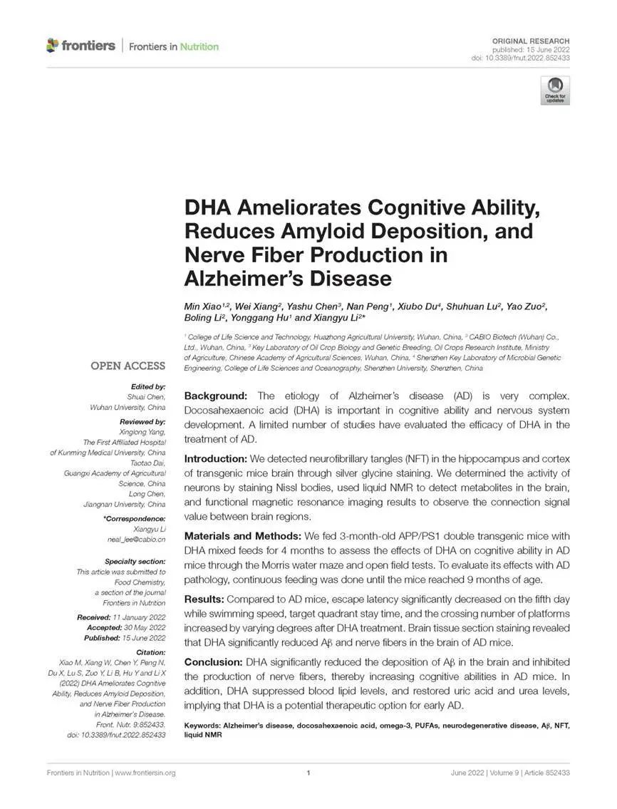 2022年6月,一篇《DHA Ameliorates Cognitive Ability,Reduces Amyloid Deposition,and Nerve Fiber Production in Alzheimer's Disease》研究論文發(fā)表在Frontiers平臺(tái)上。該研究中,實(shí)驗(yàn)人員使用APP/PS1轉(zhuǎn)基因小鼠模型,該模型在大腦中發(fā)展了與年齡相關(guān)的斑塊和纏結(jié)的積累,顯示出阿爾茨海默病的一些相關(guān)癥狀,以測試DHA有效治療阿爾茨海默病的假設(shè)。與AD對照組相比,DHA改善了小鼠的空間學(xué)習(xí)、記憶能力和焦慮。它還抑制了一些Aβ低聚物的積累和神經(jīng)原纖維纏結(jié)的形成。在小鼠模型中,DHA對實(shí)驗(yàn)小鼠肝功能、腎功能和血脂水平無明顯改善作用, 對肌醇、甘氨酸和牛磺酸的影響很??;DHA能治療改善阿爾茨海默病小鼠的認(rèn)知障礙和抑郁/焦慮行為,并且DHA通過改善血脂來緩解AD癥狀,顯著抑制AD小鼠的病理特征。結(jié)論認(rèn)為:DHA能夠改善阿爾茨海默病的認(rèn)知能力,減少淀粉樣蛋白沉積和神經(jīng)纖維的產(chǎn)生。